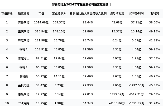 会稽山最新报告期数据为年报,下表汇总了非白酒行业内市值靠前的公司年报主要经营数据
