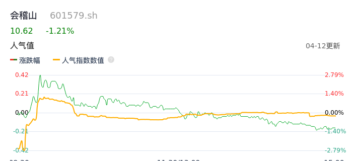 04月12日,会稽山收报10.62,股价涨幅-1.21%,成交金额9271.35万元,换手率1.79%。