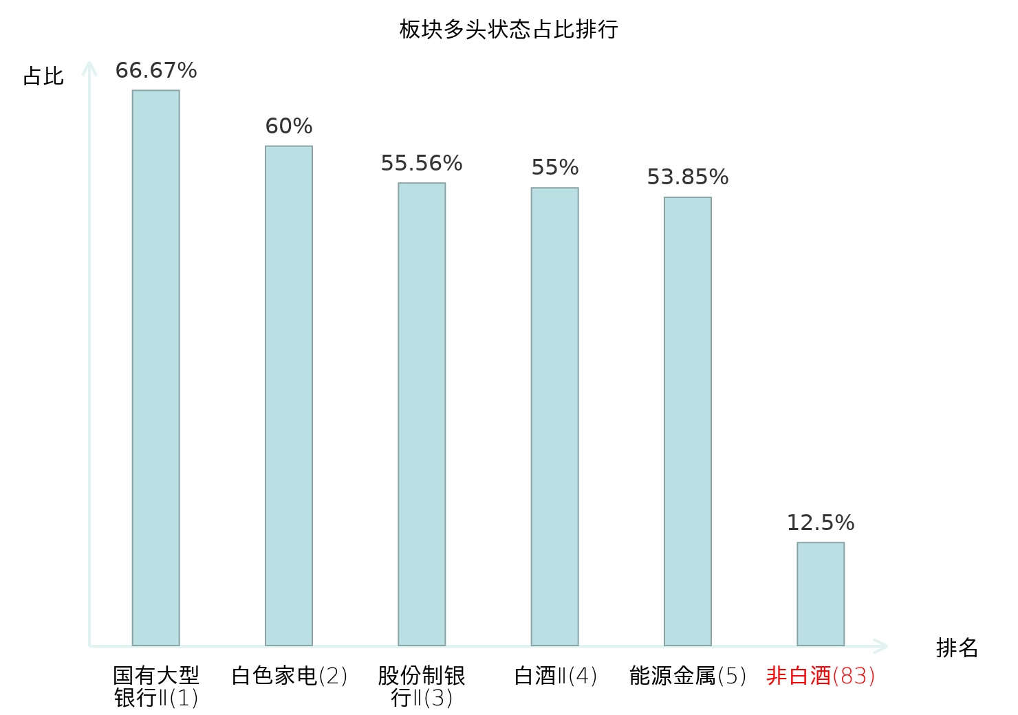 全市场所有行业板块中主力多头状态占比排名中,国有大型银行Ⅱ板块位居第一。林业Ⅱ板块名次提升最快,较昨日上升99位。