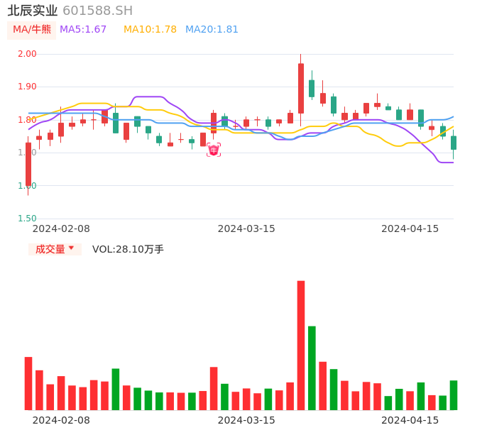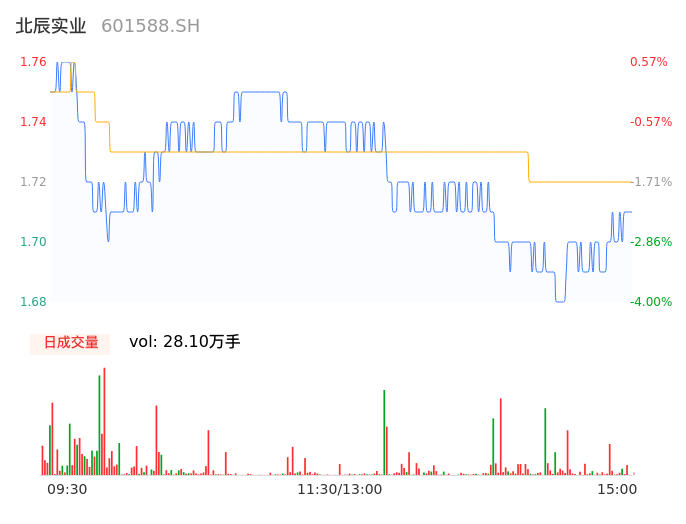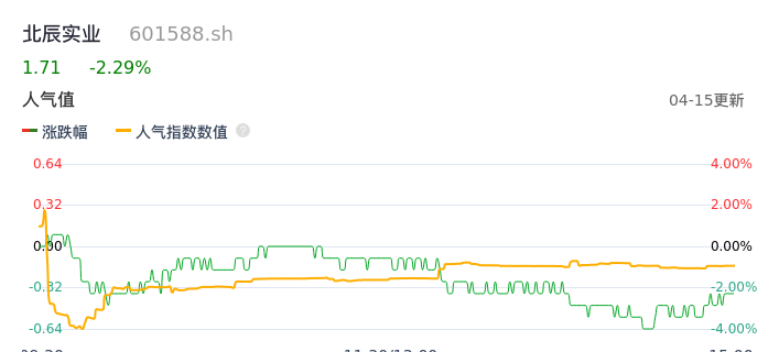 04月15日,北辰实业收报1.71,股价涨幅-2.29%,成交金额4835.05万元,换手率1.06%。