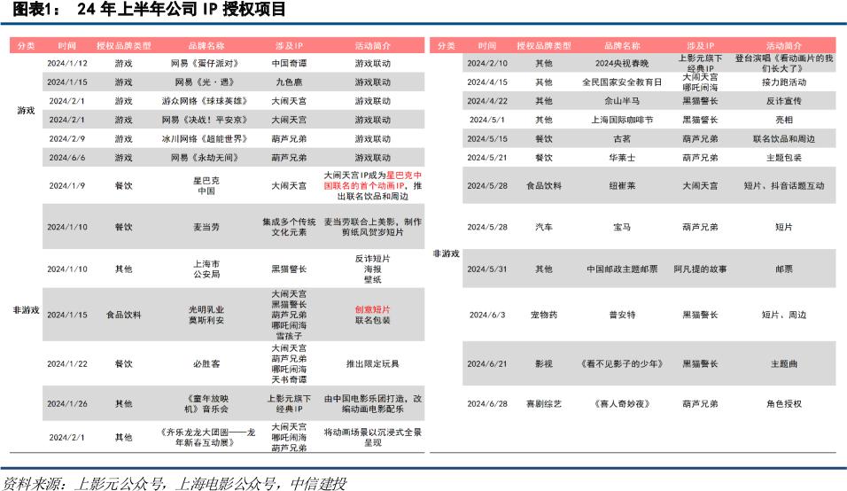 国内IP业务蓬勃发展,对标海外国内IP业务渗透率仍有较大提升空间。公司23年3月宣布拟收购控股股东所持有上影元51%的股权,收购完成后公司拥有了集团60个优质IP开发运营权,包括葫芦兄弟、大闹天宫、黑猫警长、哪吒闹海、中国奇谭等。此后大IP也成为公司重要战略方向,公司积极推进IP焕新&变现,当前主要包括商品及营销授权、游戏联动及授权、文创产品、数字化开发等,长期空间巨大。