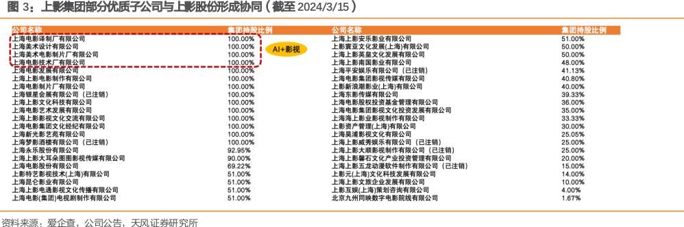 24年2月29日公司发布iNEW新战略,宣布1)探索中国动画学派大模型训练,牵头成立研发共同体,加速布局AI影视垂直领域;2)发起全球AI创造者计划:启动先导项目“上影AI电影马拉松大赛”,吸纳AI影视全球人才;3)成立iPAi数字业务中心进行IP数字资产化,推动AI技术应用研发和算力搭建;4)集团旗下多子公司皆积极布局AI,共同赋能公司发展,有望进一步放大IP价值。