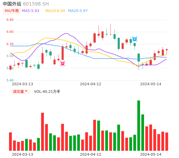 05月14日,中国外运收报6.17,股价涨幅0.16%,成交金额2.46亿元,换手率0.76%。