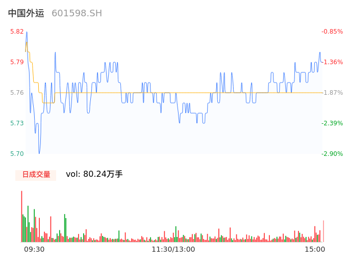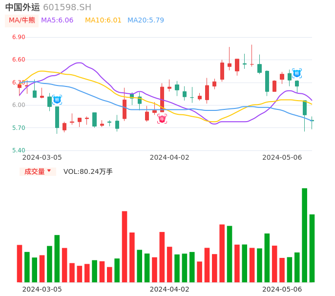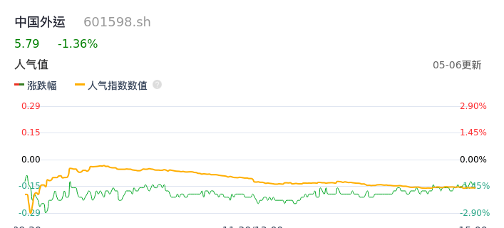 05月06日,中国外运收报5.79,股价涨幅-1.36%,成交金额4.62亿元,换手率1.53%。