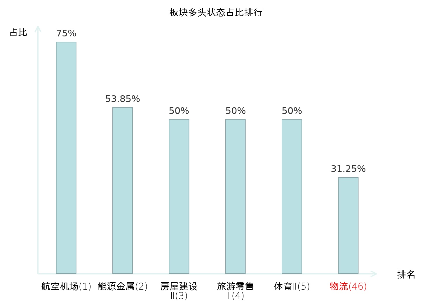 全市场所有行业板块中主力多头状态占比排名中,航空机场板块位居第一。其他电子Ⅱ板块名次提升最快,较昨日上升53位。