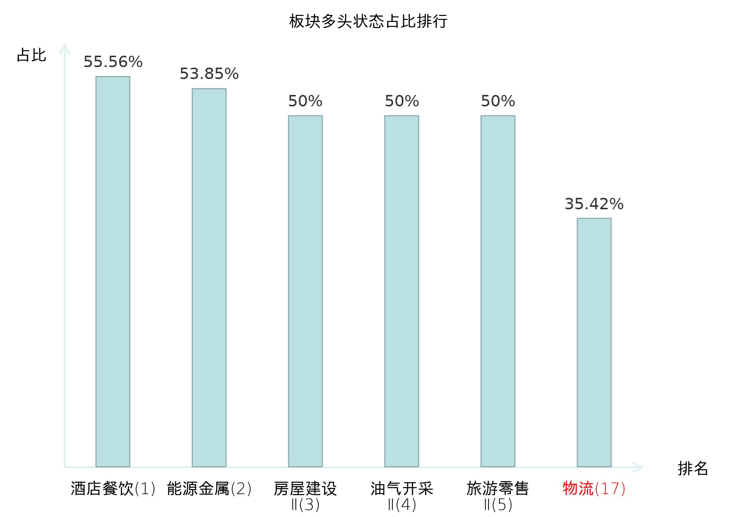全市场所有行业板块中主力多头状态占比排名中,酒店餐饮板块位居第一。饰品板块名次提升最快,较昨日上升84位。