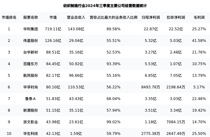 浙文影业最新报告期数据为三季度,下表汇总了纺织制造行业内市值靠前的公司三季度主要经营数据