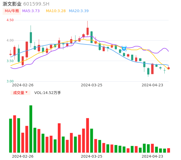 04月23日,浙文影业收报3.34,股价涨幅2.14%,成交金额4855.07万元,换手率1.63%。