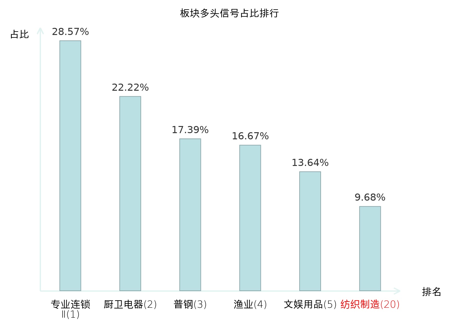 全市场所有行业板块中主力多头信号占比排名中,专业连锁Ⅱ板块位居第一。专业连锁Ⅱ板块名次提升最快,较昨日上升120位。