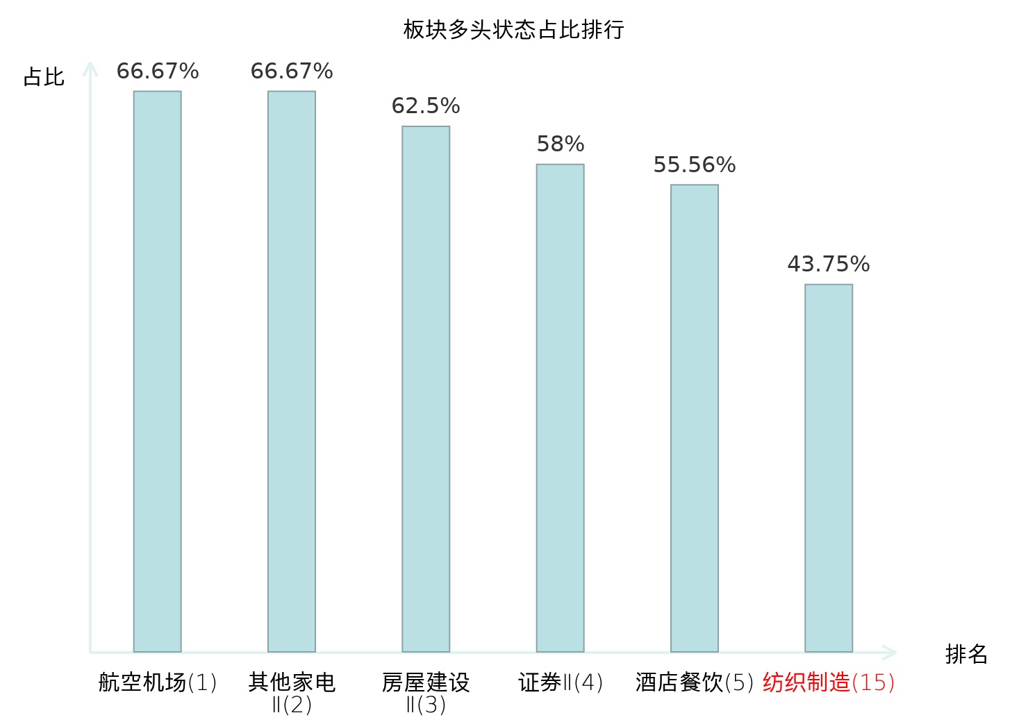 全市场所有行业板块中主力多头状态占比排名中,航空机场板块位居第一。装修建材板块名次提升最快,较昨日上升62位。