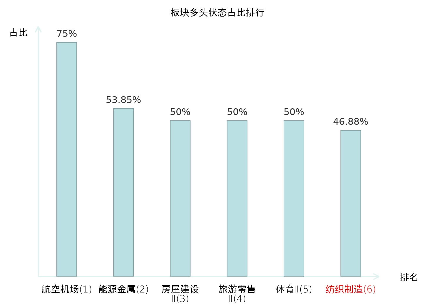 全市场所有行业板块中主力多头状态占比排名中,航空机场板块位居第一。其他电子Ⅱ板块名次提升最快,较昨日上升53位。