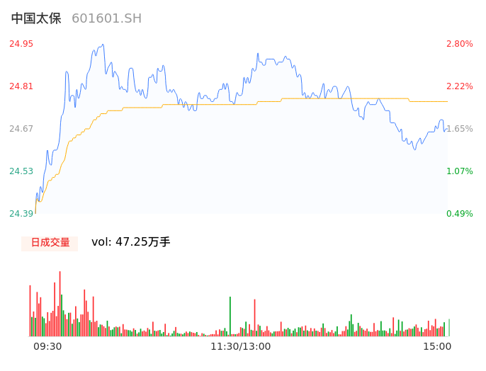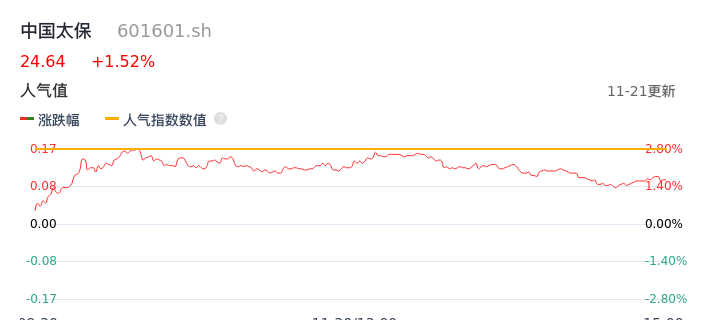 11月21日,中国太保收报24.64,股价涨幅1.52%,成交金额11.70亿元,换手率0.69%。