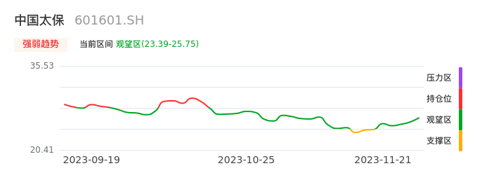 我们来看一下该股的九方特色指标强弱趋势的情况:中国太保自11月15日从支撑区回到观望区。股价前期快速下跌后经过中途弱势整理。目前短期处于弱势反弹迹象,后续重点关注能否站上多空分界点:25.75元。如未能有效突破则说明弱势反弹行情结束。后续可能再次进入空头行情。