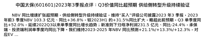 值得注意的是:2023年11月开源证券的高超/吕晨雨分析师,首次发布关于中国太保的研究报告,标题为:中国太保(601601)2023年3季报点评:Q3价值同比超预期 供给侧转型升级持续验证。
