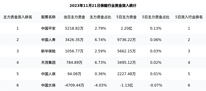 中国太保今日净流出4709.44万元,主力占比4.03%,在行业内排名:6/6;5日净流出1.13亿元,主力占比0.07%,在行业内排名:6/6。