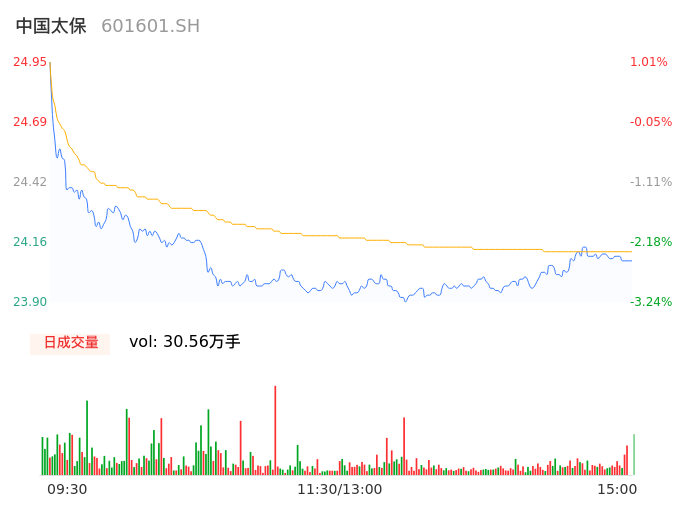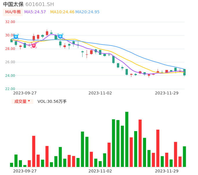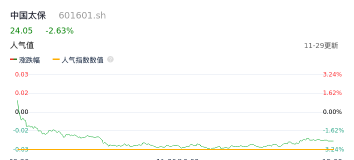 11月29日,中国太保收报24.05,股价涨幅-2.63%,成交金额7.37亿元,换手率0.45%。