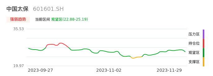 我们来看一下该股的九方特色指标强弱趋势的情况:中国太保自11月15日从支撑区回到观望区。股价经过前期快速下跌后中途弱势整理。现在下跌动能有重新放大迹象,弱势反弹行情可能临近尾声。建议继续谨慎观望。