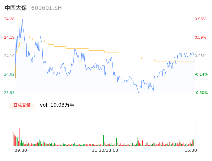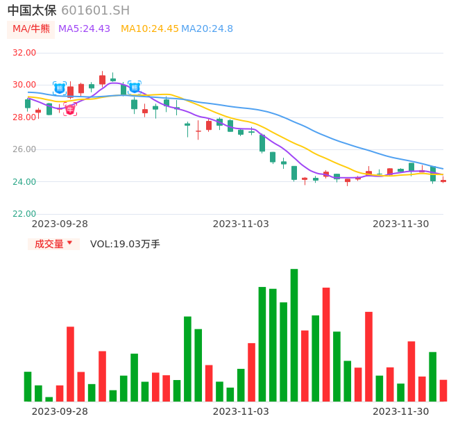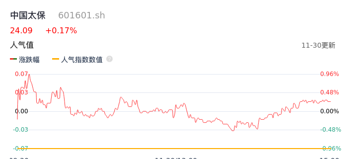 11月30日,中国太保收报24.09,股价涨幅0.17%,成交金额4.58亿元,换手率0.28%。