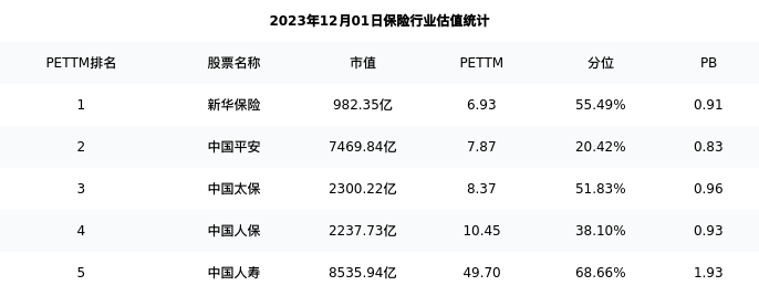 从估值角度看:中国太保最新市盈率PETTM为8.37,在行业内排名3/6,处于51.83分位。