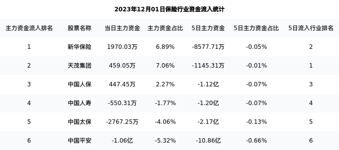 中国太保今日净流出2767.25万元,主力占比4.06%,在行业内排名:5/6;5日净流出2.17亿元,主力占比0.13%,在行业内排名:5/6。