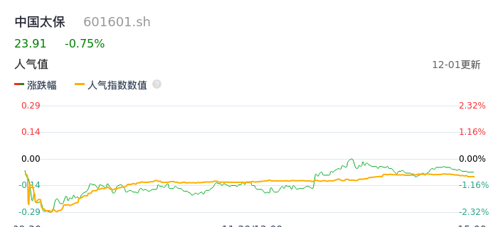 12月01日,中国太保收报23.91,股价涨幅-0.75%,成交金额6.81亿元,换手率0.42%。