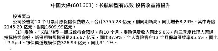 值得注意的是:2023年11月中邮证券的王泽军分析师,首次发布关于中国太保的研究报告,标题为:中国太保(601601):长航转型有成效 投资收益待提升。