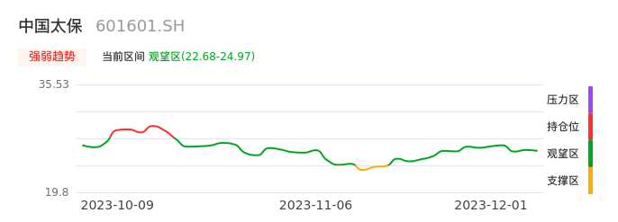 我们来看一下该股的九方特色指标强弱趋势的情况:中国太保自11月15日从支撑区回到观望区。股价经过前期快速下跌后中途弱势整理。现在下跌动能有重新放大迹象,弱势反弹行情可能临近尾声。建议继续谨慎观望。