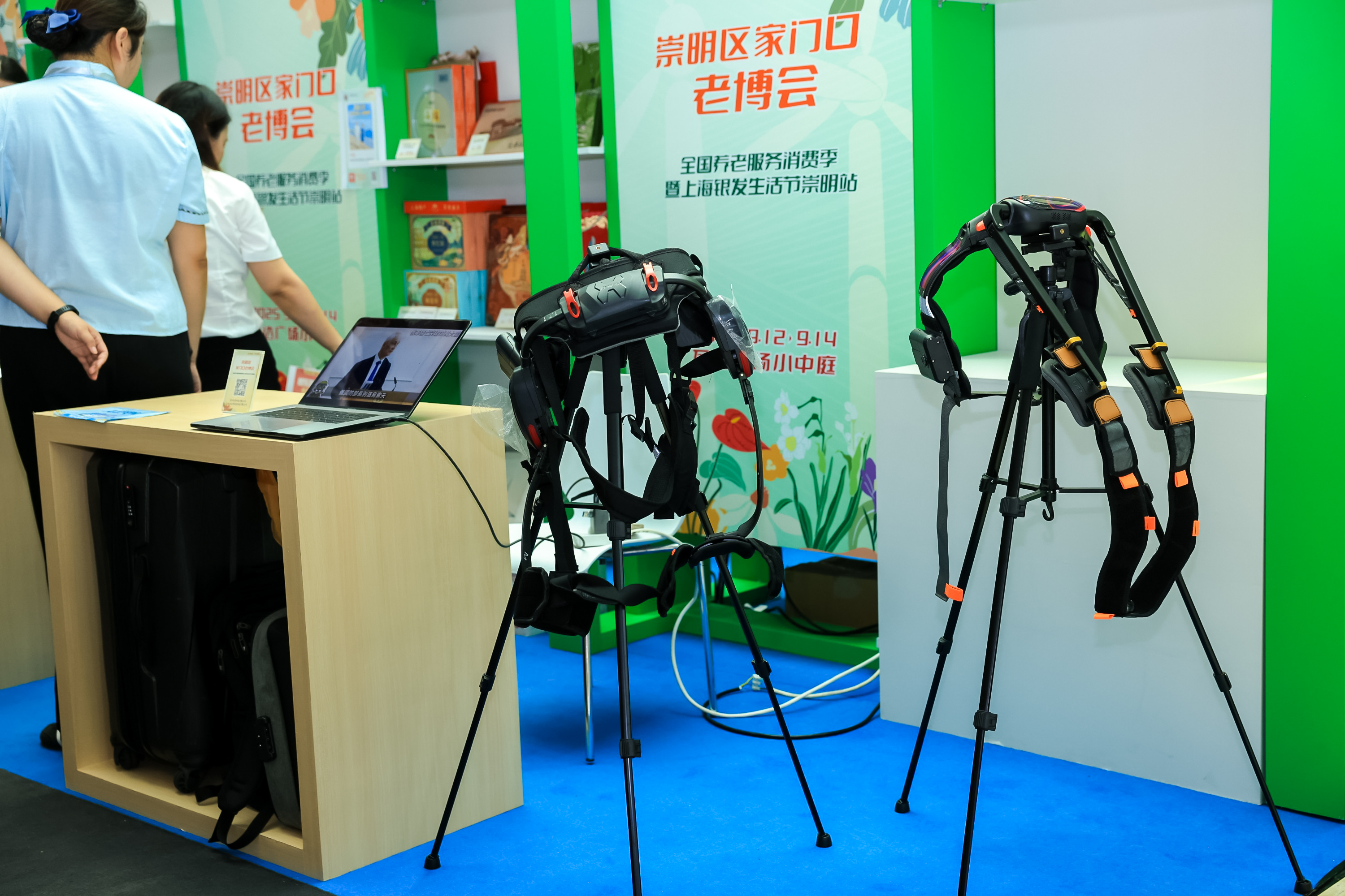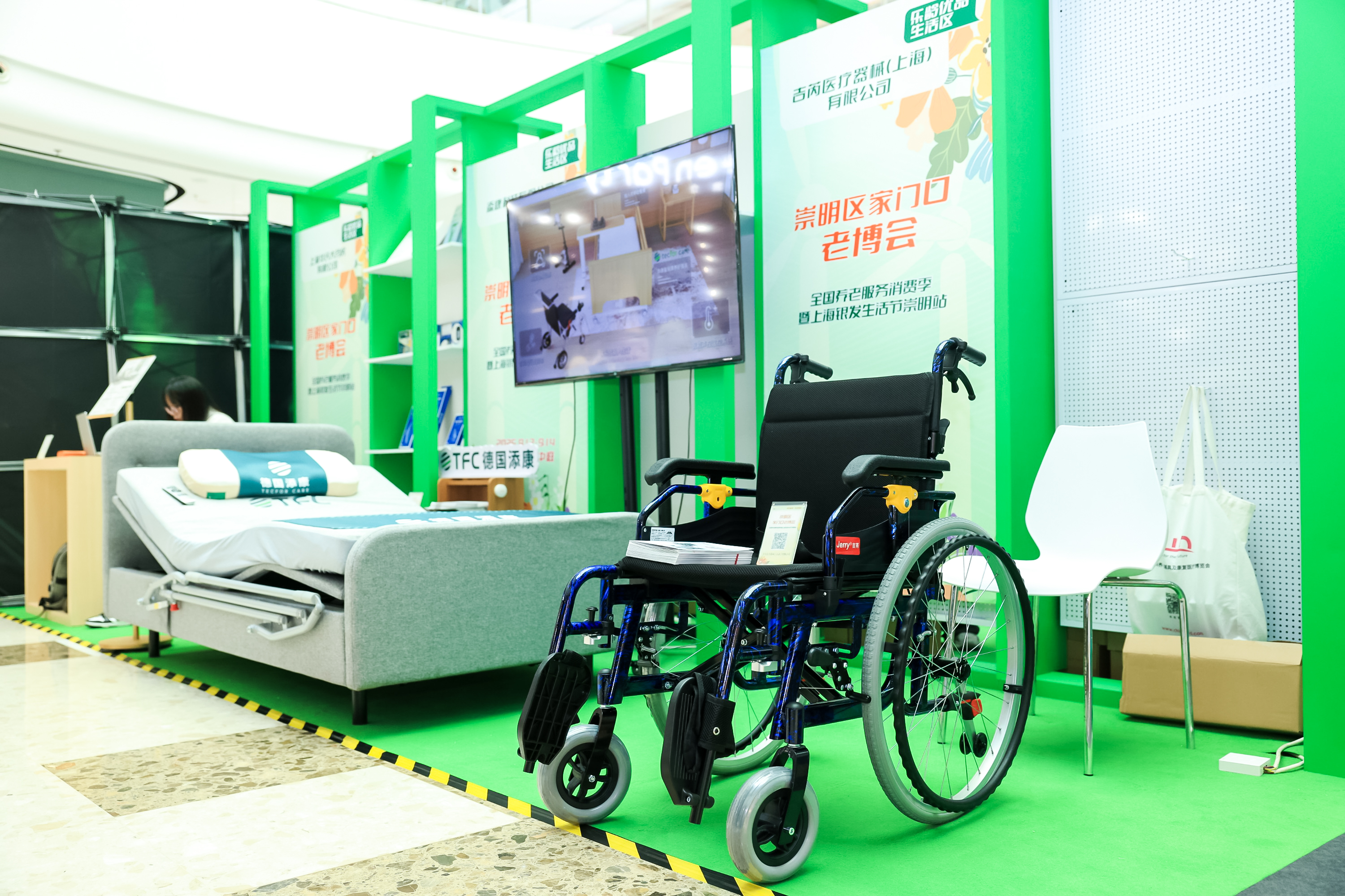 本次崇明老博会主会场规划五大功能展区,涵盖居家、科技、生活、认知守护与养老服务等多维度内容,真正实现“一展逛遍银发生活”。在“安心居家体验区”,中进宏康、泰禾、鼎植、海尔、沪尚茗居、佳德丽等品牌集中展示适老化改造与智能家居解决方案。“智慧颐养科技区”由肯綮、中国邮政、中国移动、芙兰舒、中国电信、天与等企业领衔,展出外骨骼机器人等前沿科技产品以及居家养老数字化设备。“乐龄优品生活区”汇聚了世道、颐爸妈、福至、华氏大药房、添康、吉芮、海之声等品牌,产品涵盖老年鞋、电动床、助起沙发等全系列辅具,并配套有乐龄驾校轮椅体验区,提供轮椅、助行器等产品的试驾体验。“记忆友好守护区”聚焦认知症辅助与居家干预方案,太保蓝、福晞、吉槐树、AI回忆录等品牌带来多项创新产品与服务。“颐养臻享服务区”则集中展示了太保家园、信澜天地、民福养护院 、广德大运等崇明本土优质养老机构、康养文旅的服务特色、环境设施等内容,同时由中国银行、建设银行提供老年人专属金融产品咨询服务,助力银发群体拥抱数字时代。