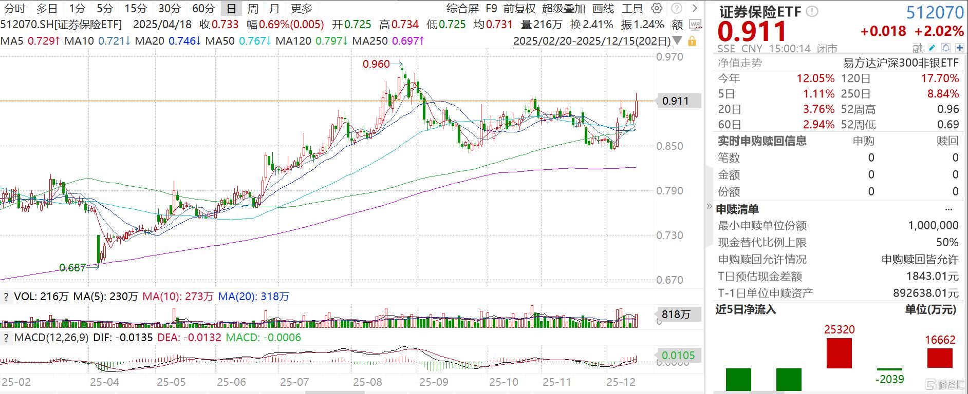 证券保险ETF(512070)年内涨超12%,规模162亿元,其跟踪沪深300非银行金融指数,证券(61.4%)+保险37.7%。