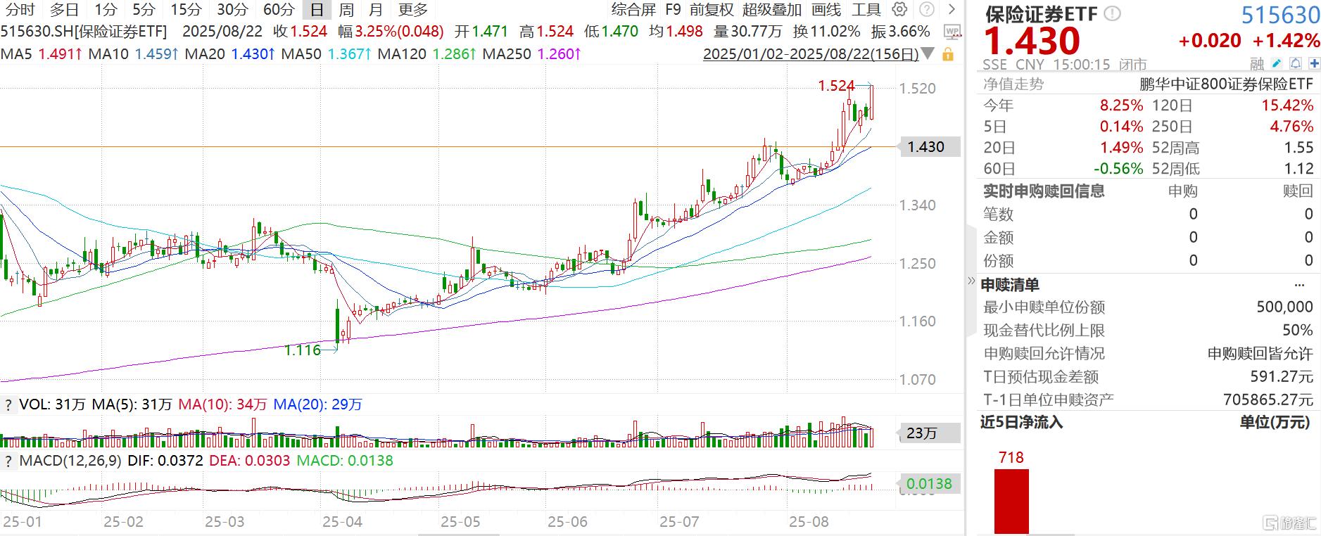 保险证券ETF(515630)年内涨超8%,规模4.99亿元,其跟踪中证800证券保险指数,证券(74.4%)+保险(25.6%)。