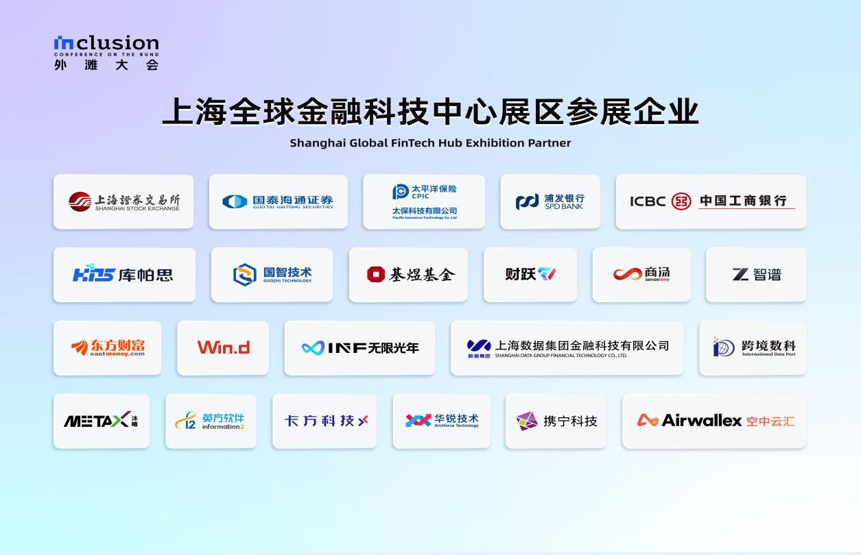 上海证券交易所、国泰海通证券股份有限公司、上海浦东发展银行股份有限公司、中国工商银行股份有限公司、中国太平洋保险(集团)股份有限公司、上海库帕思科技有限公司、上海财跃星辰智能科技有限公司、上海商汤智能科技有限公司、上海智谱寰宇科技有限公司、无限光年(上海)技术有限公司、上海临港新片区跨境数据科技有限公司、上海数据集团金融科技有限公司、东方财富信息股份有限公司、万得信息技术股份有限公司、上海国智技术有限公司、上海基煜基金销售有限公司、空中云汇(上海)网络科技公司、上海华锐软件有限公司、上海英方软件股份有限公司、上海卡方信息科技有限公司、沐曦集成电路(上海)股份有限公司、上海携宁计算机科技股份有限公司等22家金融机构、科技公司参展。