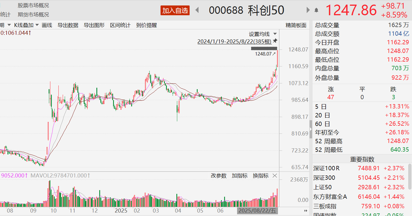 与此同时,今日科创50指数涨8.59%,创下近三年多以来新高。科创板总市值前三席位,也已尽数被半导体板块的寒武纪、海光信息、中芯国际包揽。