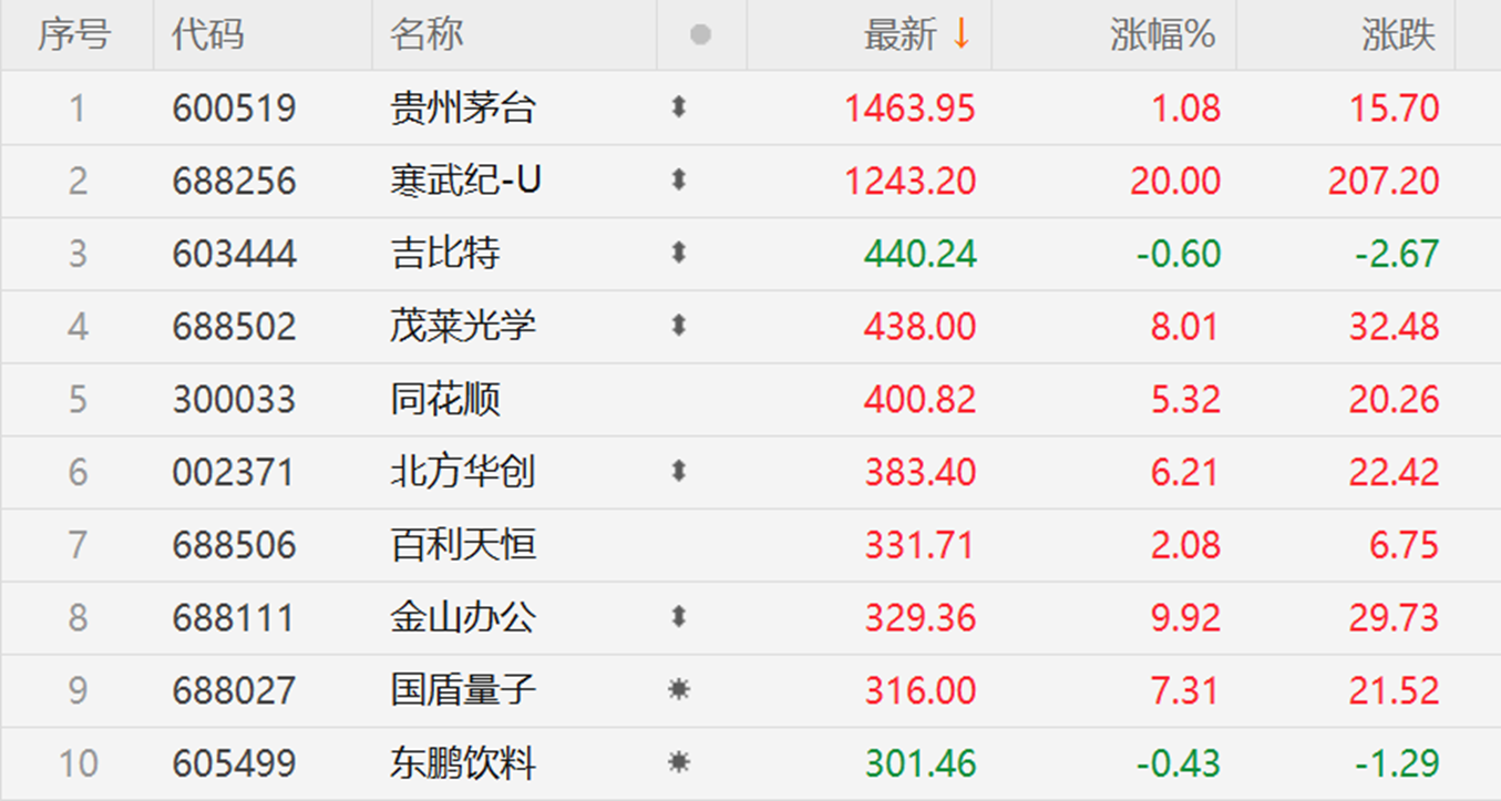 值得留意的是,A股高价股TOP 10中,有一半都是科创板公司,除了股价与贵州茅台仅差220元的寒武纪之外,还有茂莱光学、百利天恒、金山办公与国盾量子。