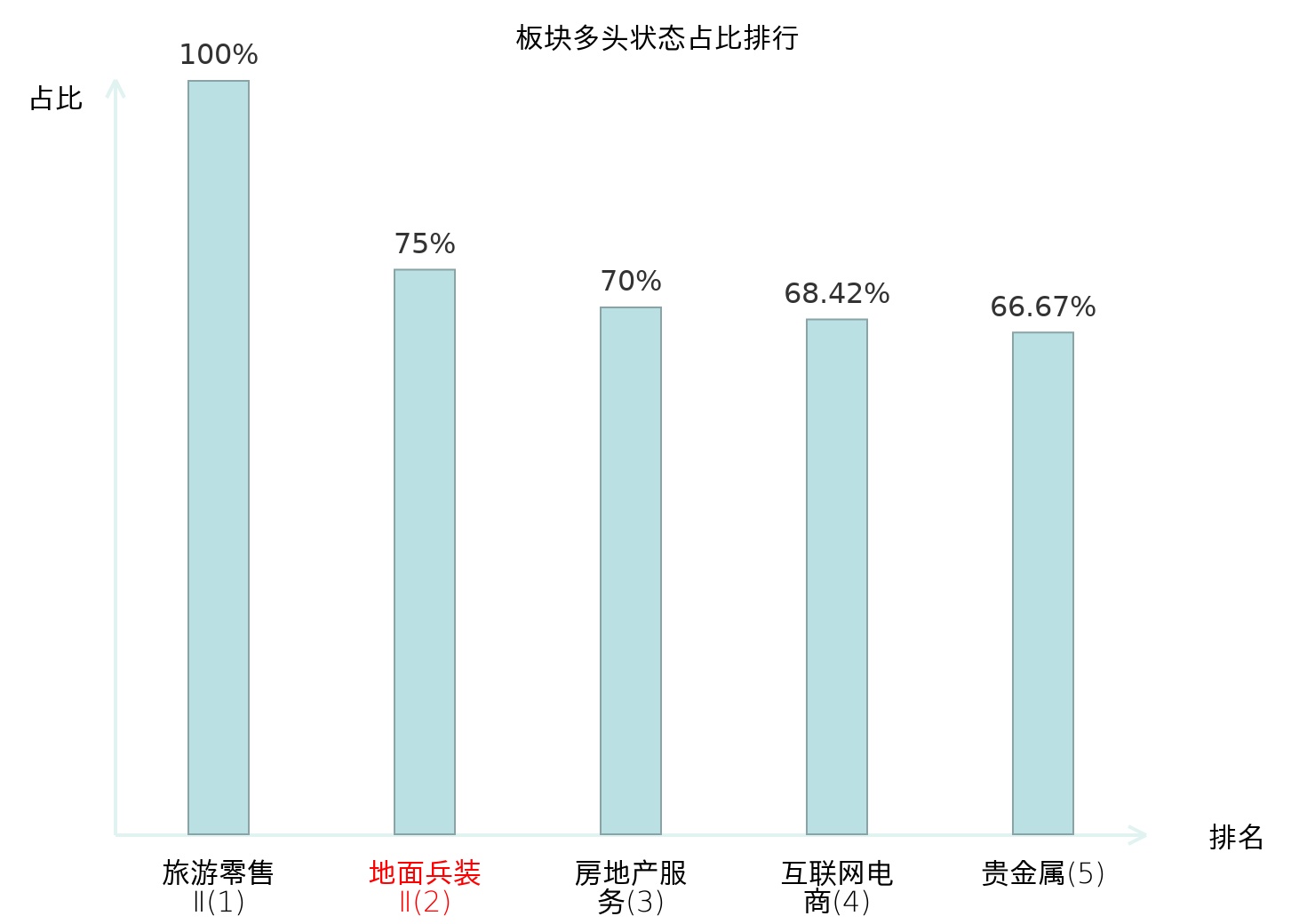 全市场所有行业板块中主力多头状态占比排名中,旅游零售Ⅱ板块位居第一。白色家电板块名次提升最快,较昨日上升65位。
