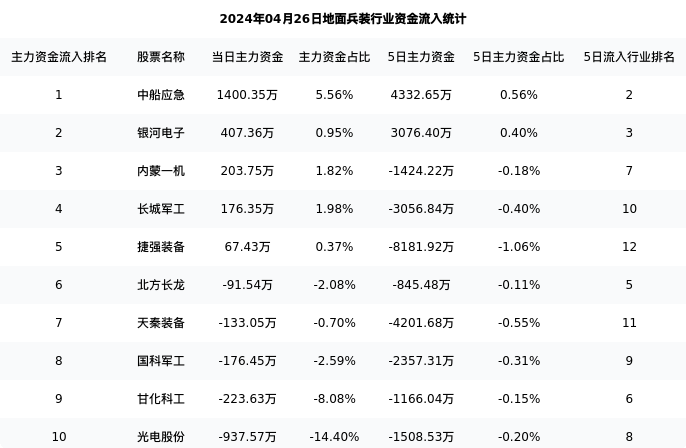 从主力资金流向来看,地面兵装行业今日主力资金流入7.74亿元,在所有申万二级行业中排名:45/131。