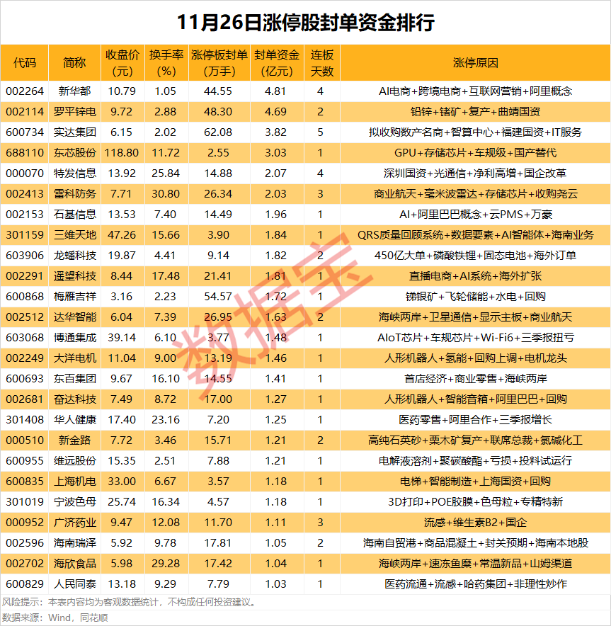 以封单金额计算,28股封单资金均超1亿元,新华都罗平锌电实达集团封单资金居前,分别为4.81亿元、4.69亿元、3.82亿元。