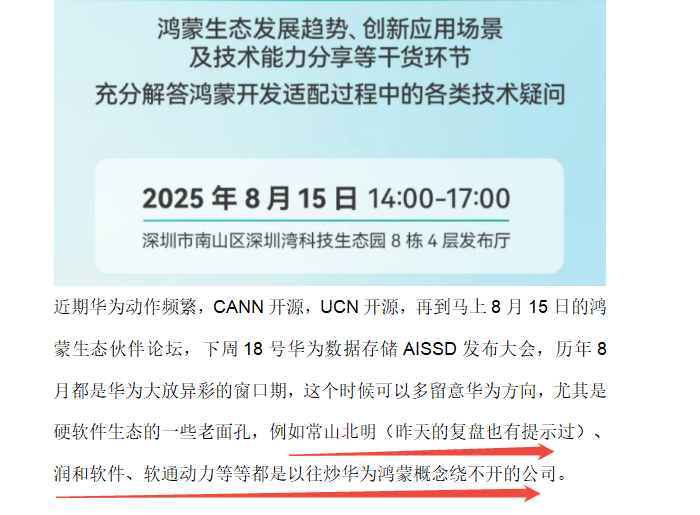 另外一个方向也有一定力度的集体异动的是,鸿蒙方向的几个老龙头,润和软件一度涨近17%,软通动力近10%,常山北明超8%,这个方向我们在上周三的晚间复盘和大家做的提醒,周五有鸿蒙伙伴论坛,加上周末余承东参加央视的对话节目谈到:三分天下必有鸿蒙,华为鸿蒙系统“会走向全球,对国家智能终端和机器设备的操作系统自主化具有重要意义,上午AI硬件较为强势,下午资金轮动切换到软件端补涨也是一个很合理的现象。有没有同学成功潜伏到的?