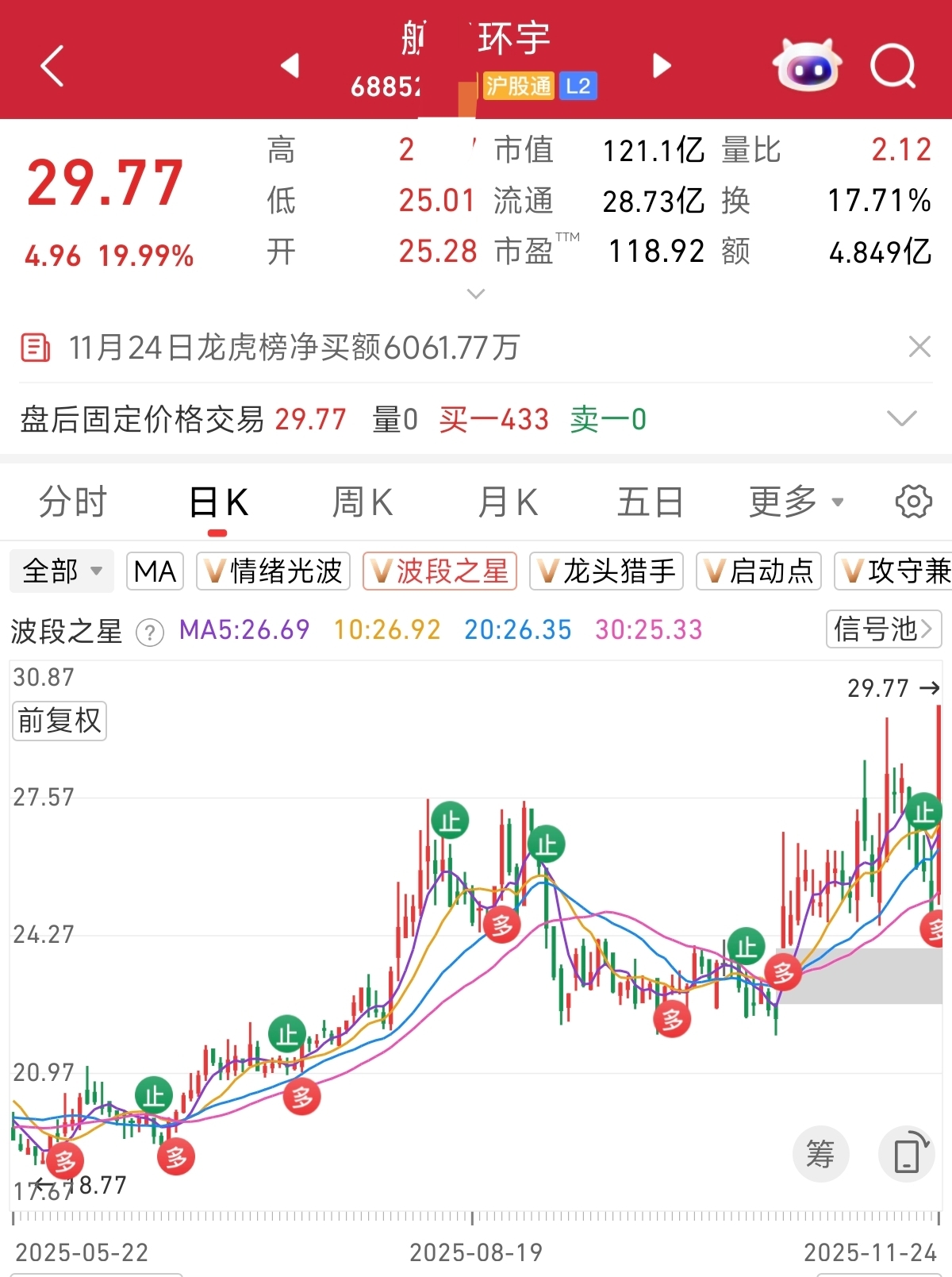新产业的发展不会一蹴而就,往往会有好几波机会。如果有投资人想关注概念龙头的波段机会,可以使用专业波段工具“波段之星”(点击解锁),出现“多”就是入场做多信号,出现“止”就是止盈止损信号。