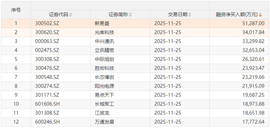 个股方面,25股获融资净买入额超1亿元。新易盛获融资净买入额居首,净买入5.13亿元;融资净买入金额居前的还有光库科技、中兴通讯,、立讯精密、中际旭创、胜宏科技、长芯博创、阳光电源、易点天下、长城军工等。