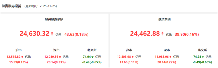 上证报中国证券网讯11月25日,A股两融余额为24630.32亿元,较上一交易日增加43.63亿元,占A股流通市值比例为2.59%。当日两融交易额为1879.83亿元,较上一交易日增加230.65亿元,占A股成交额的10.29%。