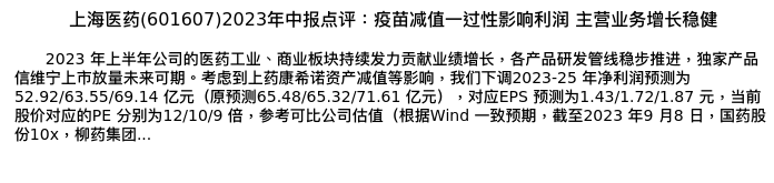 值得注意的是:2023年09月中信证券的朱奕彰/陈竹/宋硕分析师,首次发布关于上海医药的研究报告,标题为:上海医药(601607)2023年中报点评:疫苗减值一过性影响利润 主营业务增长稳健。