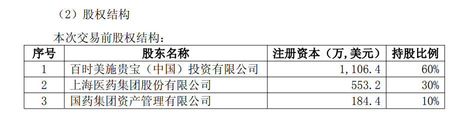 中美施贵宝成立于1982年,注册资本1844万美元,是我国首批中外合资制药企业之一。目前,该公司股权结构为百时美施贵宝(中国)投资有限公司持股60%,上海医药和国药集团资产管理有限公司分别持股30%和10%。