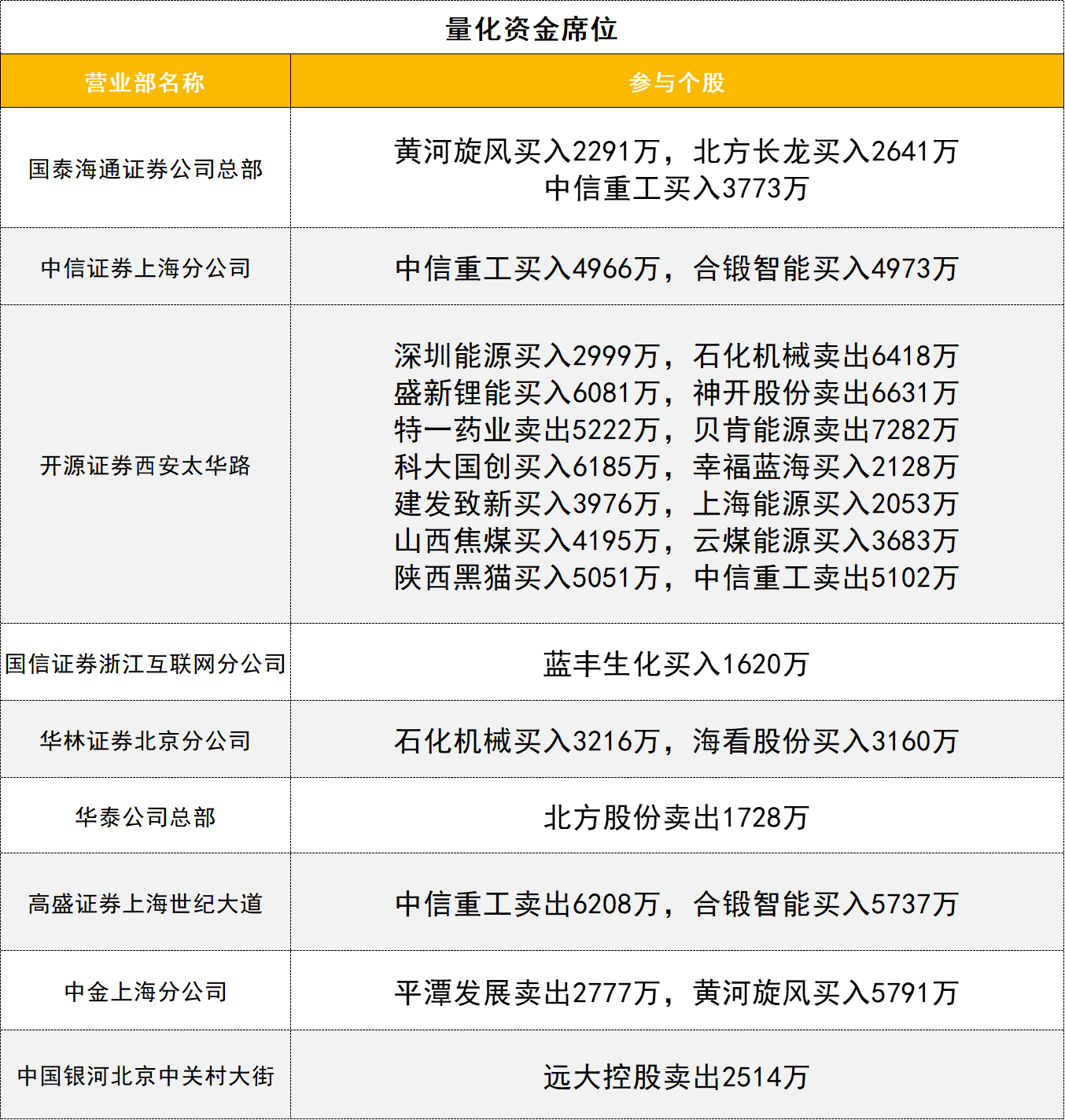量化资金活跃度较高,盛新锂能获一家量化席位买入6081万。中信重工获两家量化席位合计买入8739万,同时遭两家量化席位合计卖出1.1亿。