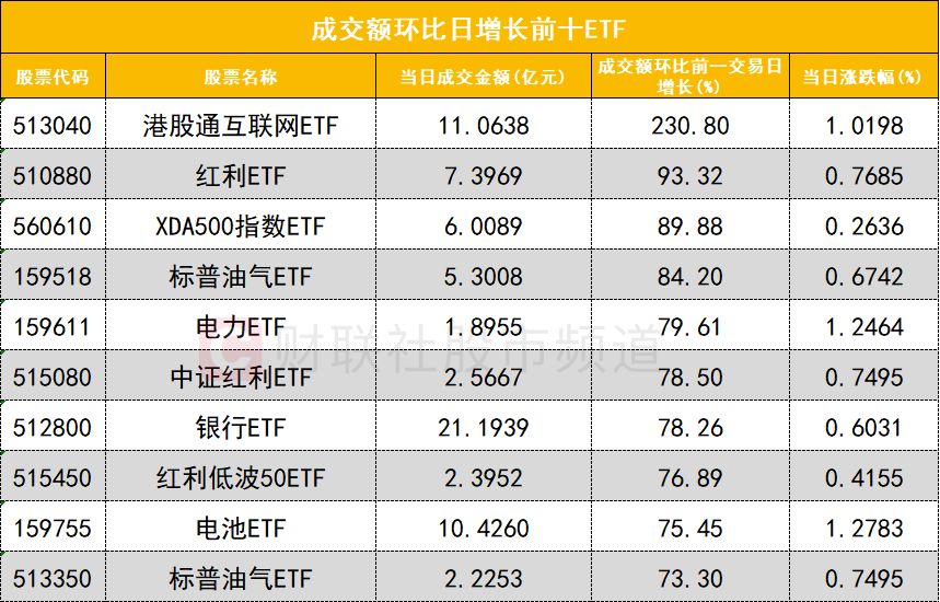 从成交额环比增长前十的ETF来看,港股通互联网ETF(513040)成交额环比增长230%位居首位;红利ETF(510880)成交额环比增长93%位居次席。