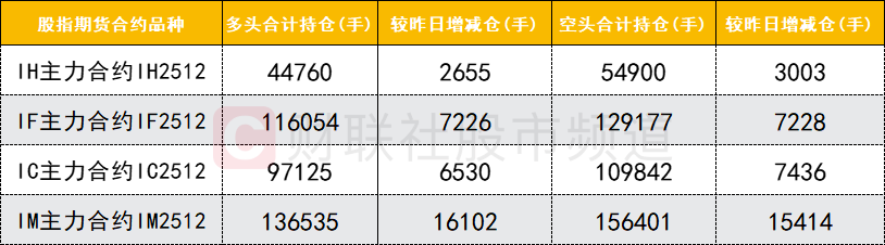 四大期指主力合约中,IH、IF、IC、IM合约多空双方均加仓,IM合约多头加仓数量较多。