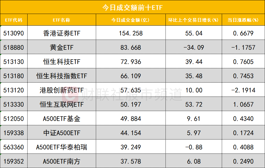 从成交额前十的ETF来看,香港证券ETF(513090)成交额位居首位,黄金ETF(518880)成交额位居次席。