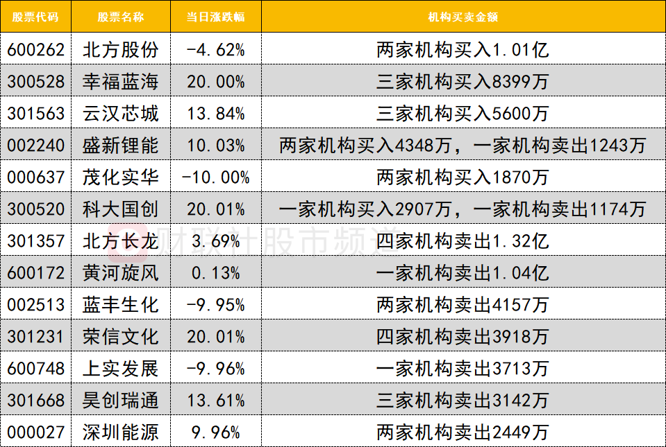 今日龙虎榜机构活跃度一般,买入方面,科大国创获一家机构买入2907万,深股通席位买入2687万,同时遭一家机构卖出1174万。盛新锂能获两家机构合计买入4348万。