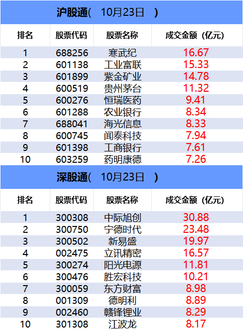 从沪股通前十大成交个股来看,寒武纪位居首位;工业富联、紫金矿业分居二、三位。