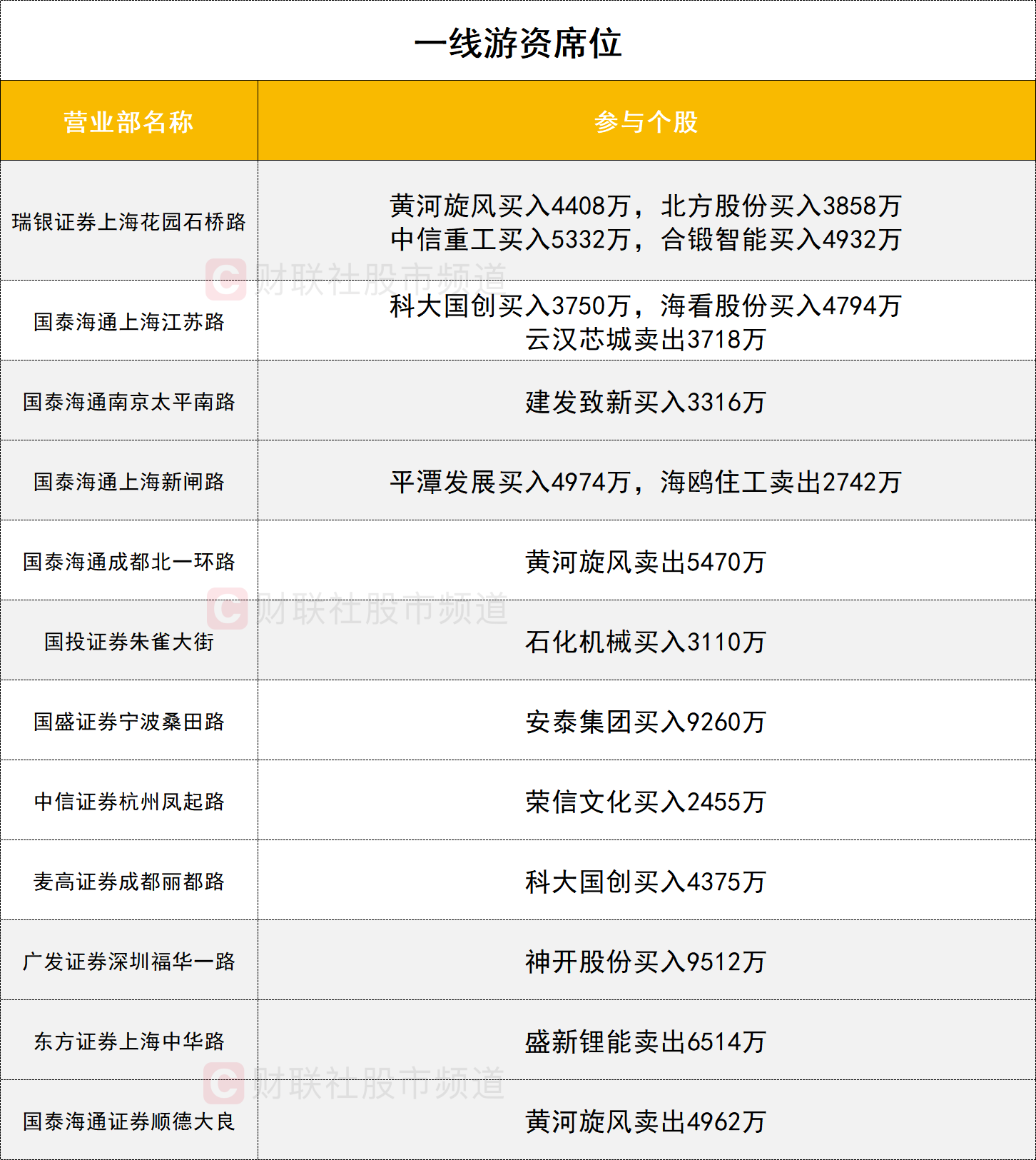 一线游资活跃度较高,科大国创获一线游资席位(国泰海通证券上海江苏路)买入3750万,同时获另一家一线游资席位买入4375万,但遭一线游资席位(华泰证券广州兴民路)卖出3278万。黄河旋风遭两家一线游资席位(国泰海通证券顺德大良和国泰海通证券成都北一环路)合计卖出1.04亿。