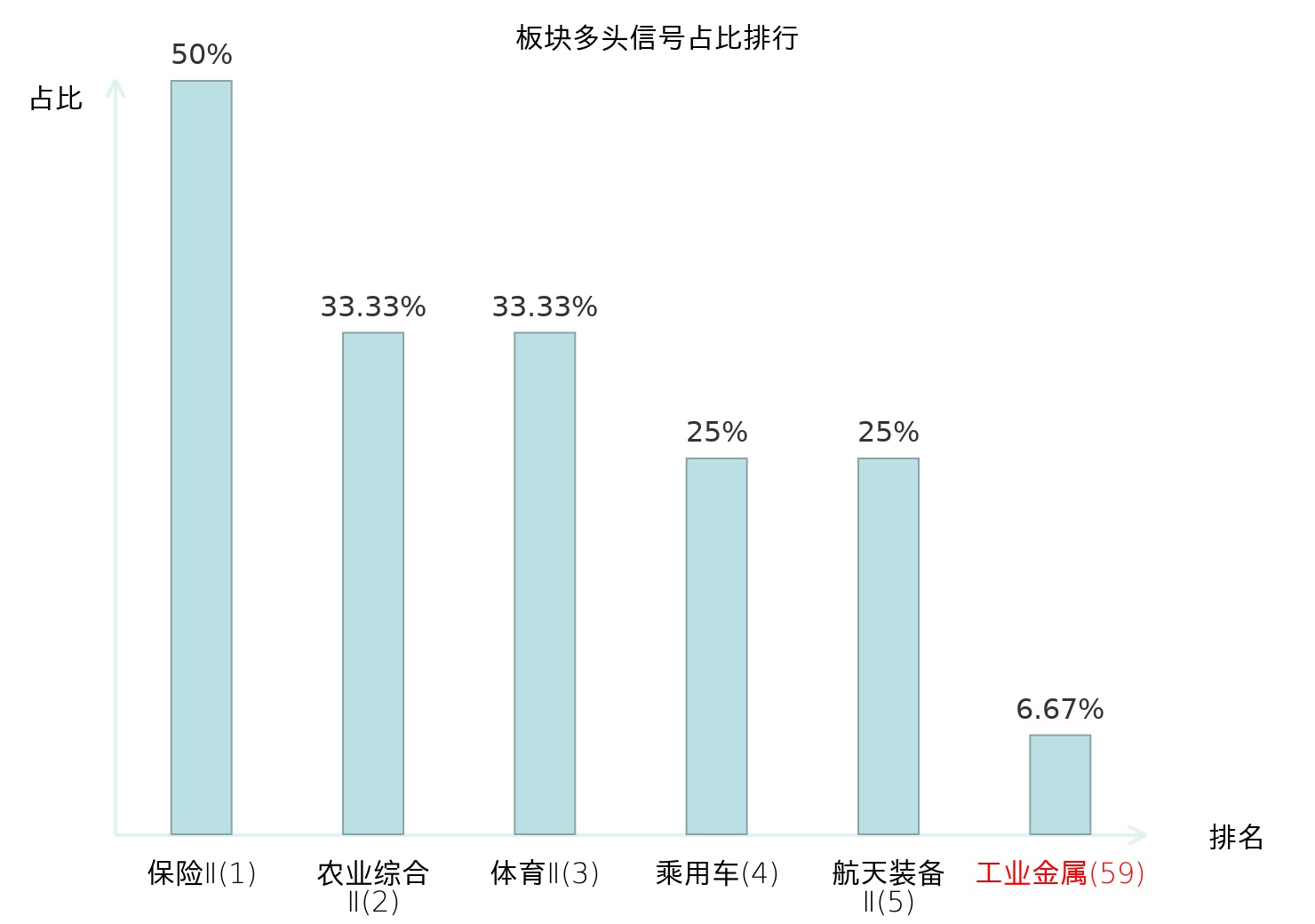 全市场所有行业板块中主力多头信号占比排名中,保险Ⅱ板块位居第一。体育Ⅱ板块名次提升最快,较昨日上升127位。
